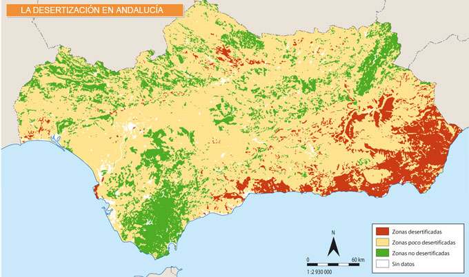 Observa el mapa y, con la ayuda de un atlas, identifica qué provincias andaluzas son las más afectadas por la desertificación.