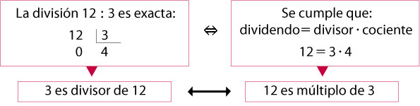 Si la división de dos números naturales, a : b, es exacta, es decir, si hay relación de divisibilidad entre ellos, entonces b es un divisor de a y, recíprocamente, a es un múltiplo de b.