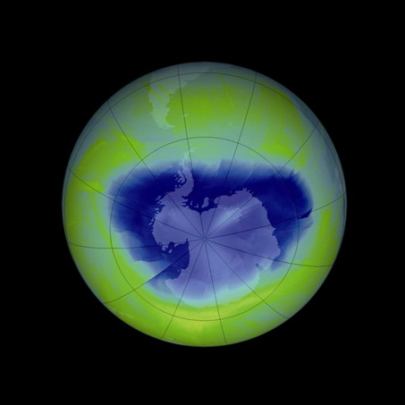 La zona más afectada por la destrucción de esta capa es la Antártida (la fotografía muestra la capa de ozono, en verde, y la zona destruida, en azul, en 2010). En este lugar de nuestro planeta cada primavera desaparece una gran cantidad del ozono existente, originándose el denominado agujero de ozono.