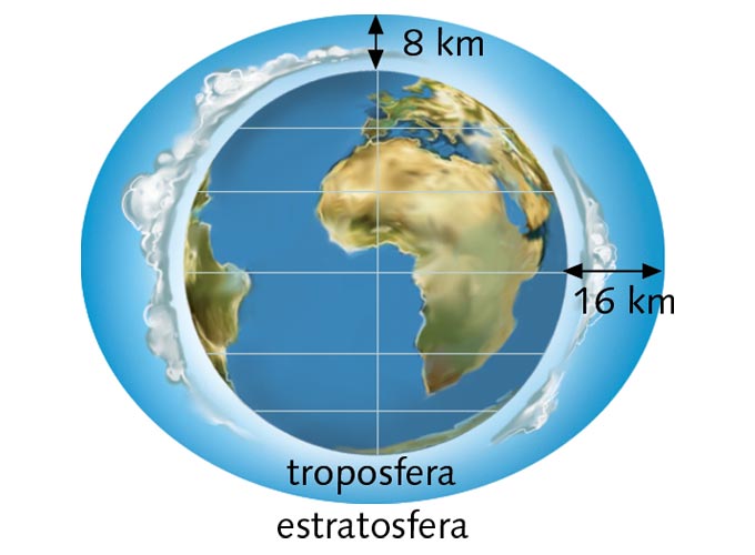La troposfera es la capa que está en contacto con la superficie terrestre. Tiene un espesor medio de 12 km, aunque es más gruesa en el ecuador, donde mide 16 km, y va disminuyendo hasta alcanzar los 8 km en los polos.