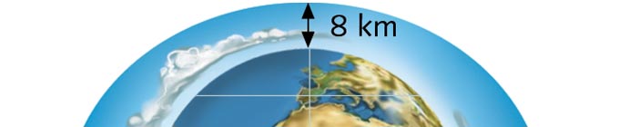 La troposfera es la capa que está en contacto con la superficie terrestre. Tiene un espesor medio de 12 km, aunque es más gruesa en el ecuador, donde mide 16 km, y va disminuyendo hasta alcanzar los 8 km en los polos.